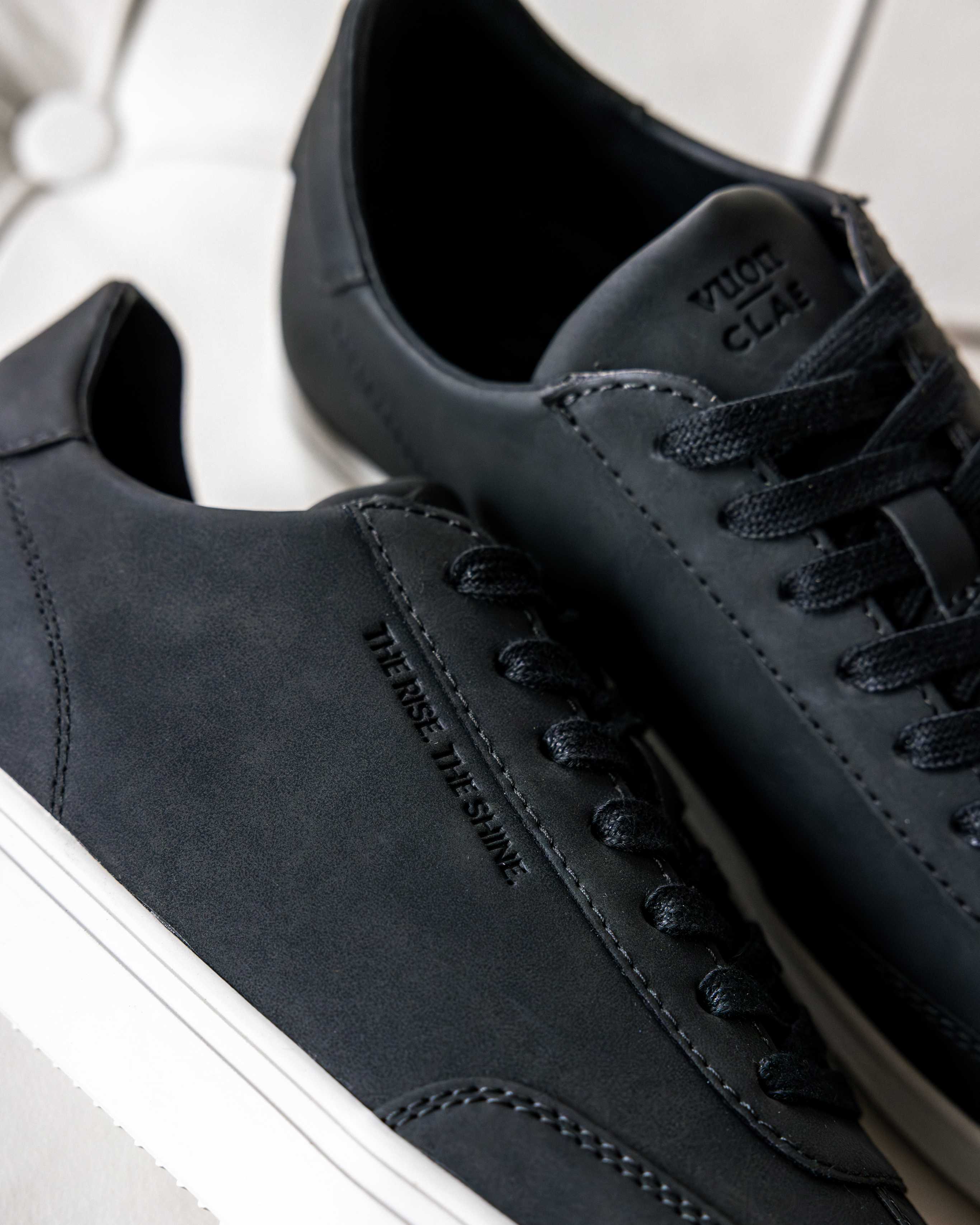 Subtle co-branding details elevate the design, with debossed CLAE x Vuori logos on the tongue, Vuori’s signature “V” logo on the heel tab, and their mantra—"The Rise, The Shine"—embossed on the side.
